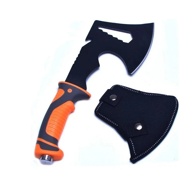 Topor multifunctional pentru camping din otel, maner cauciucat anti-alunecare, husa inclusa, portocaliu, 30 cm